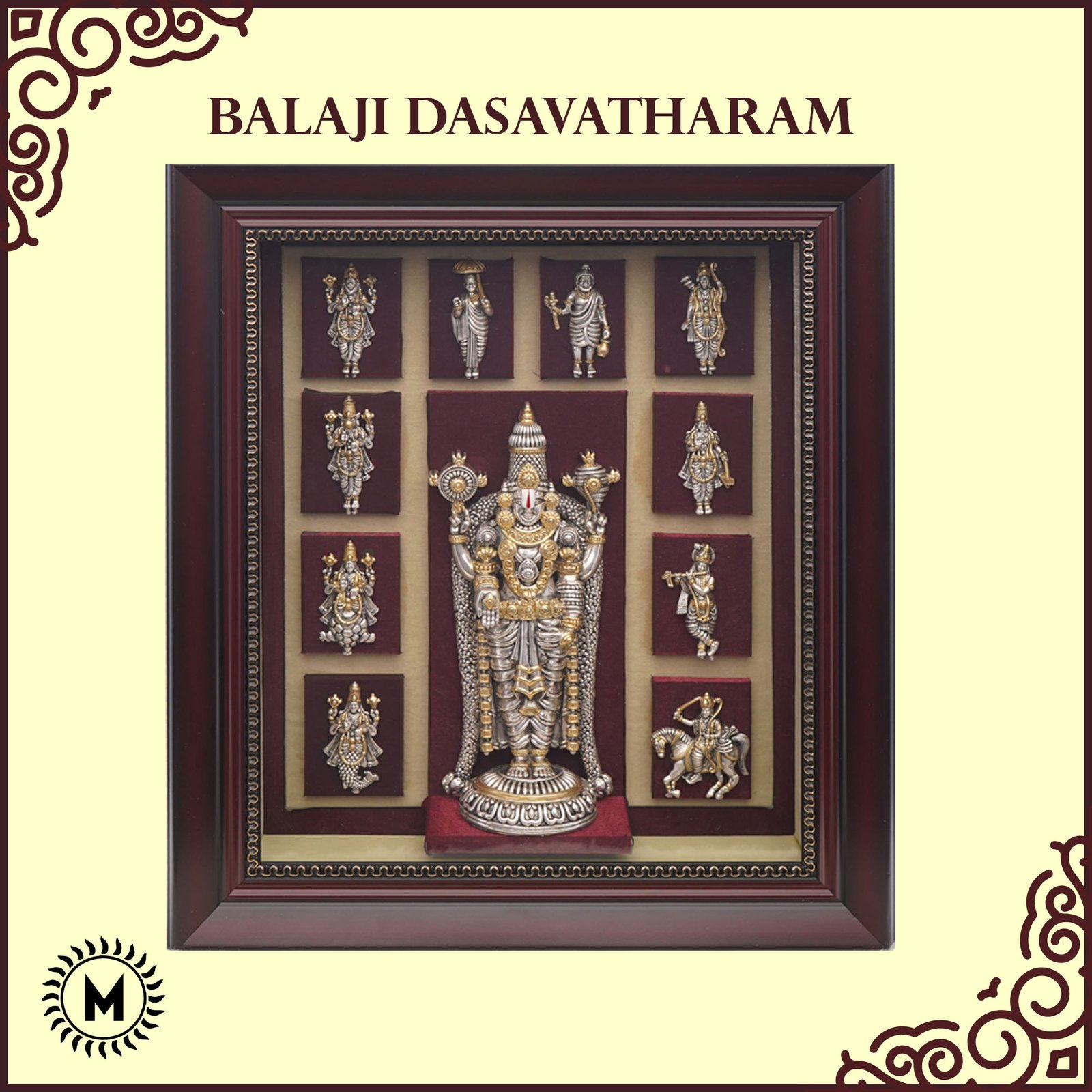 This magnificent Balaji Dasavatharam idol at 120 Gm is a grand tribute to Lord Balaji, along with the ten incarnations of Lord Vishnu. This comprehensive piece represents the full spectrum of divine power and protection. It serves as a powerful centerpiece for your home temple, bringing blessings of spiritual growth, prosperity, and protection.