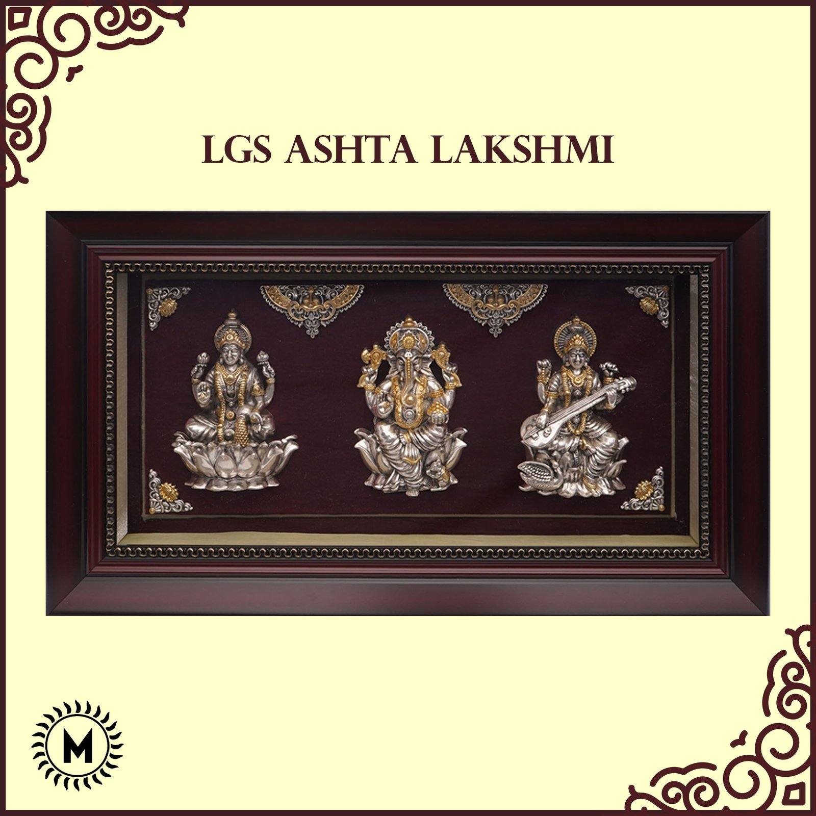 This divine LGS Ashta Lakshmi set at 160 Gm combines the blessings of Lakshmi, Ganesh, and Saraswathi (LGS) with the eight forms of Goddess Lakshmi. This comprehensive collection is a powerful symbol of wisdom, prosperity, and a complete range of wealth, making it an ideal gift or a sacred centerpiece for your home temple.