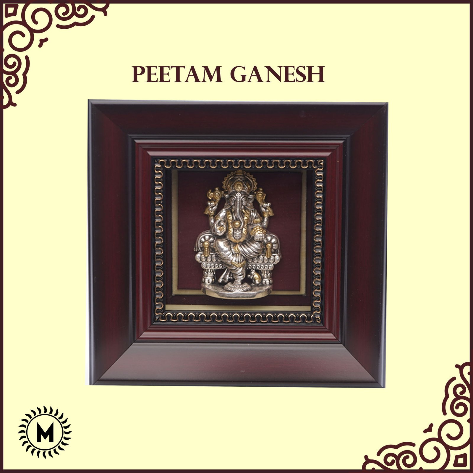 This elegant Peetam Ganesh Silver Frame depicts Lord Ganesh seated gracefully on a traditional pedestal (Peetam). The 10 Gm idol is perfect for daily worship, symbolizing stability and divine grounding. The fine silver frame provides a perfect backdrop, making it a sacred and stylish addition to any space.