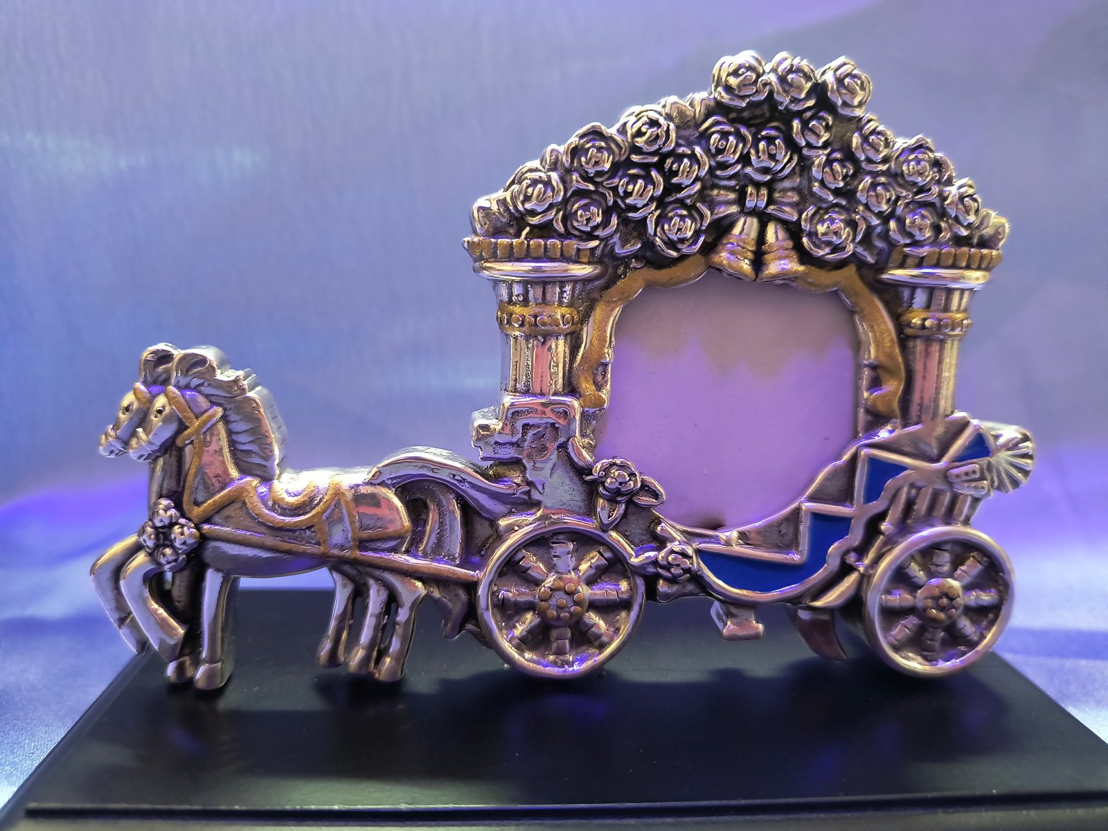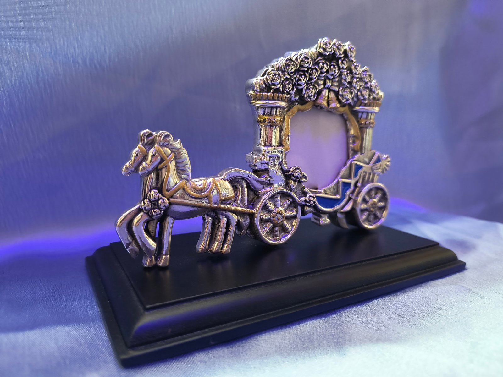 Handcrafted in pure silver with intricate detailing, this frame is ideal for enshrining the photos of deities or loved ones. The horses symbolize speed, strength, and success, while the chariot signifies victory of truth over ignorance.