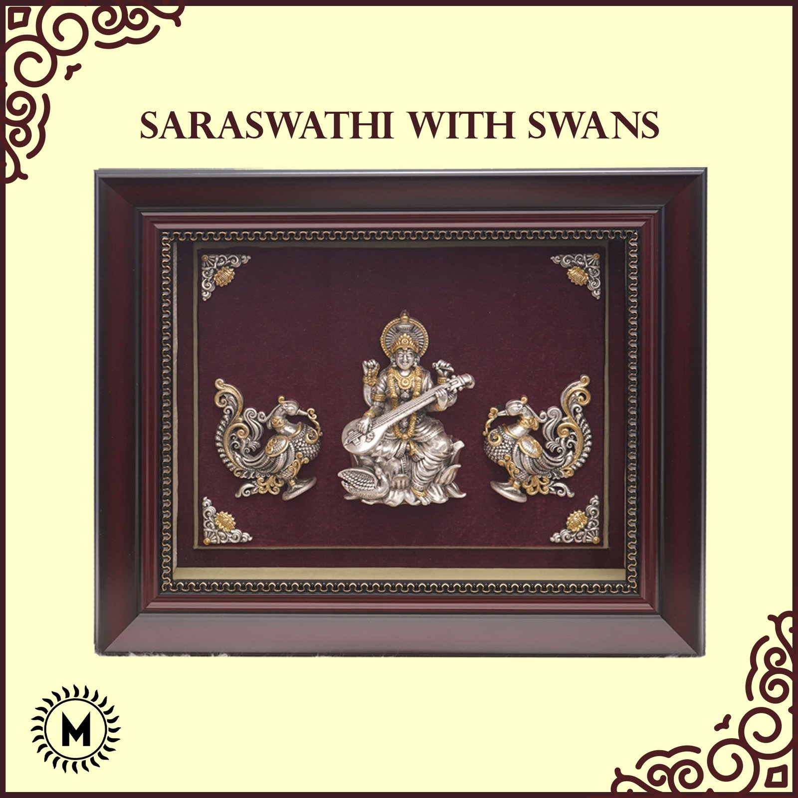 This stunning Saraswathi with Swans idol at 60 GM features the Goddess of knowledge, music, and arts with her traditional mount, the swan. The intricate craftsmanship captures her elegant form and the swan's grace. It's a powerful and inspiring piece, perfect for students, artists, and anyone seeking to enhance their wisdom and creative energy.